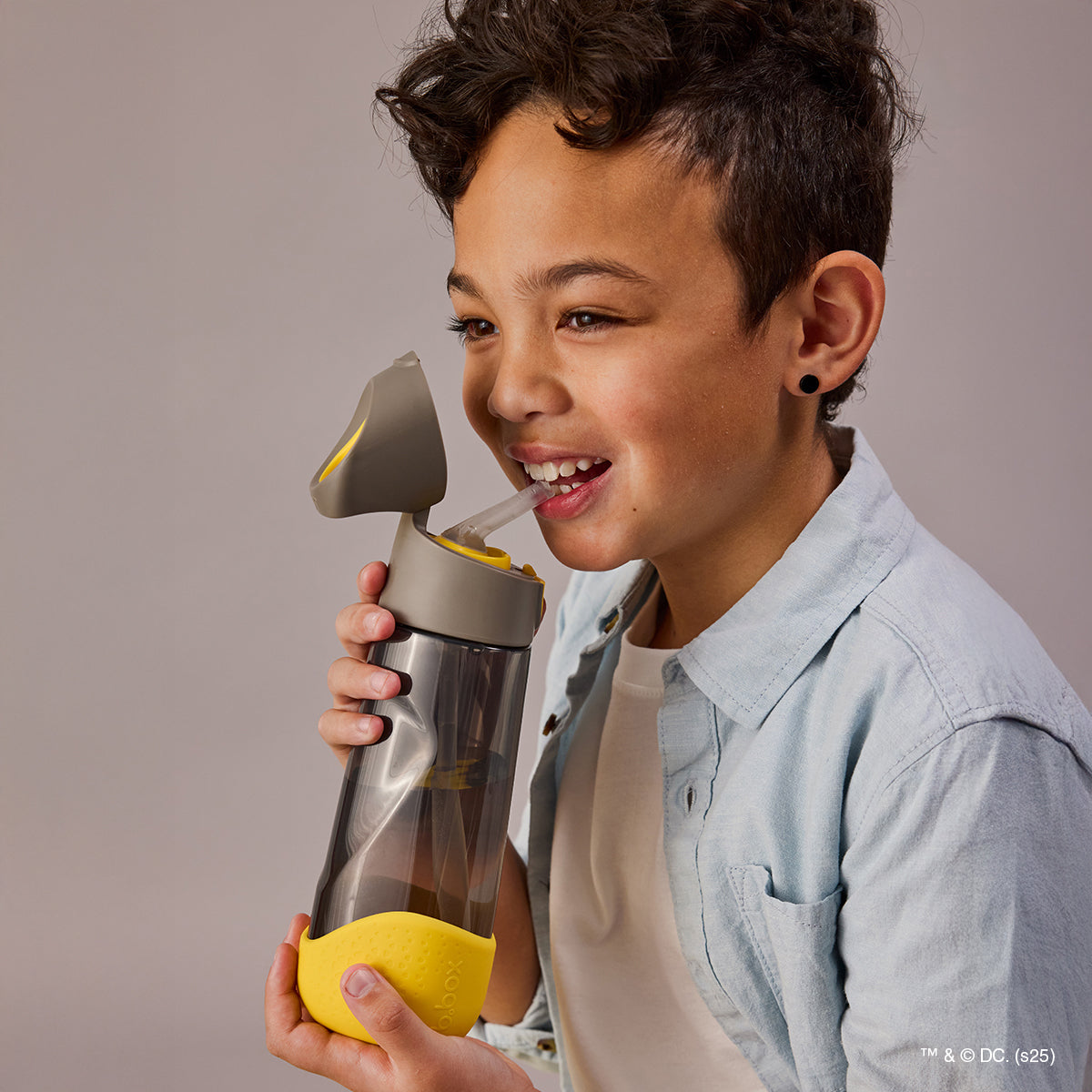 Angled silicone straw lets kids sip every last drop without tipping.
