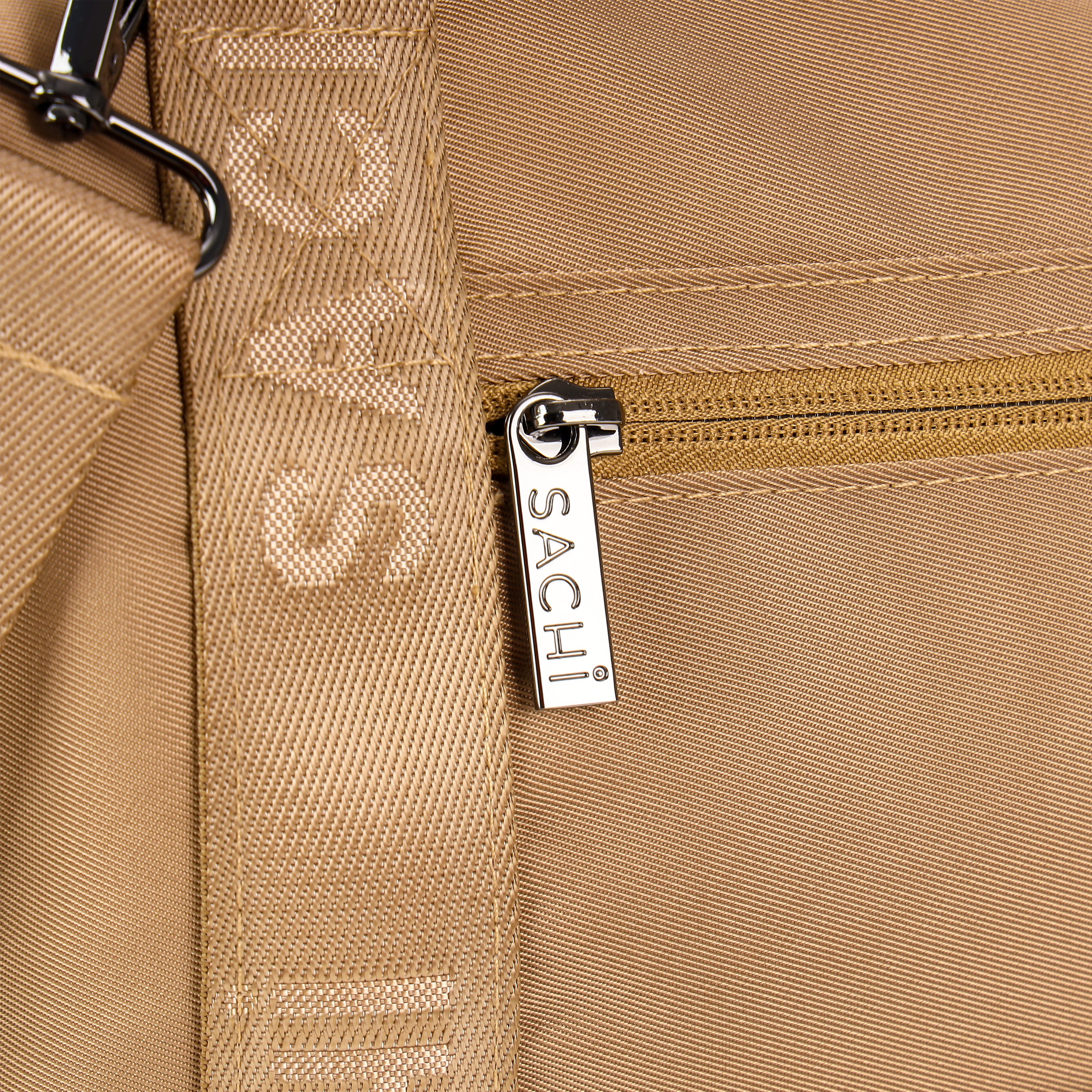 • Detachable, padded shoulder strap with jacquard Sachi branding